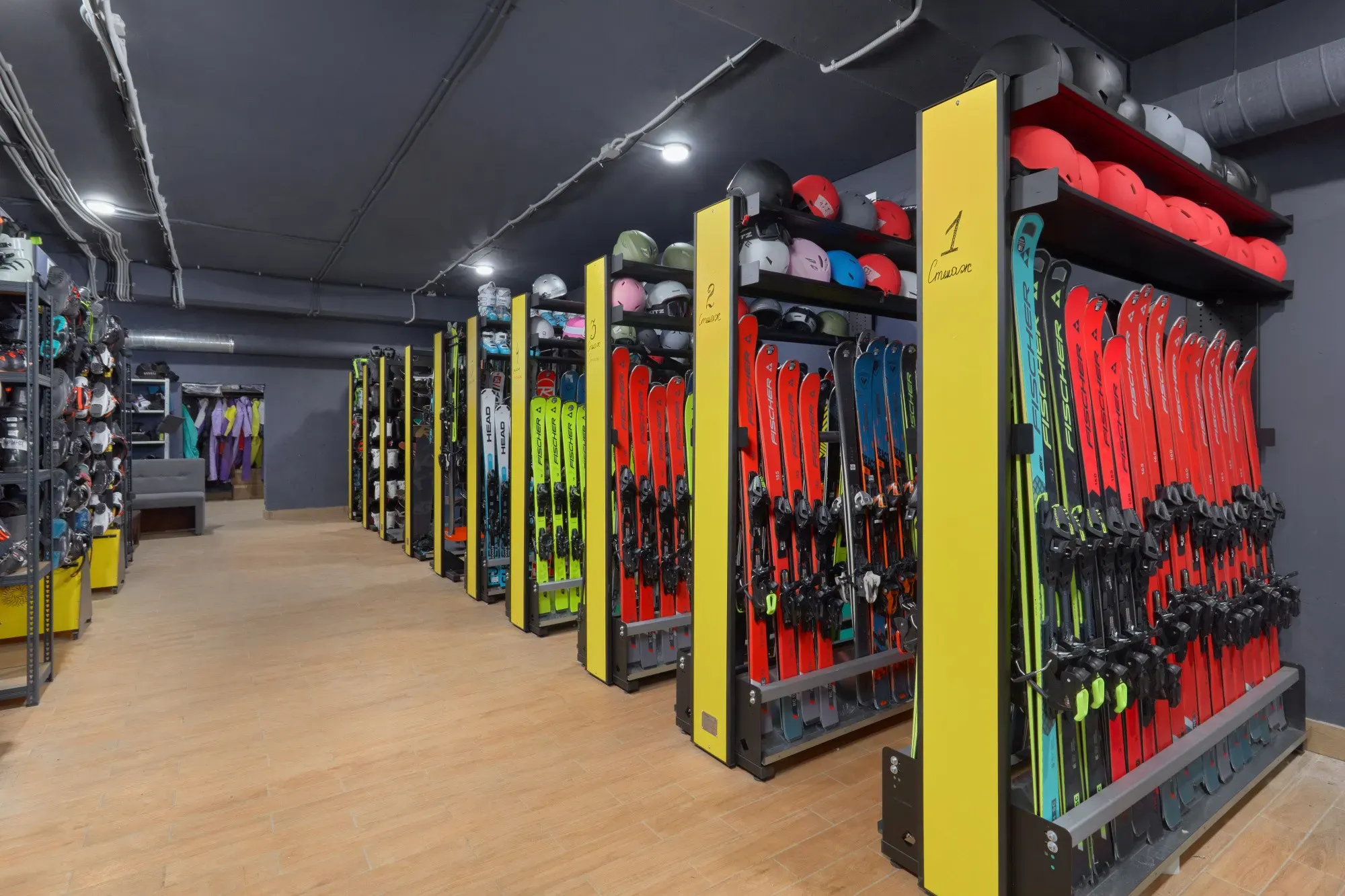 Зона для хранения лыжного снаряжения. Бесплатная общая комната для лыж и сноубордов находится на первом этаже и оборудована сушилкой для экипировки. Удобный прямой выход на улицу позволяет быстро добраться до склонов. Сдать или получить инвентарь можно ежедневно с 07:00 до 00:00.